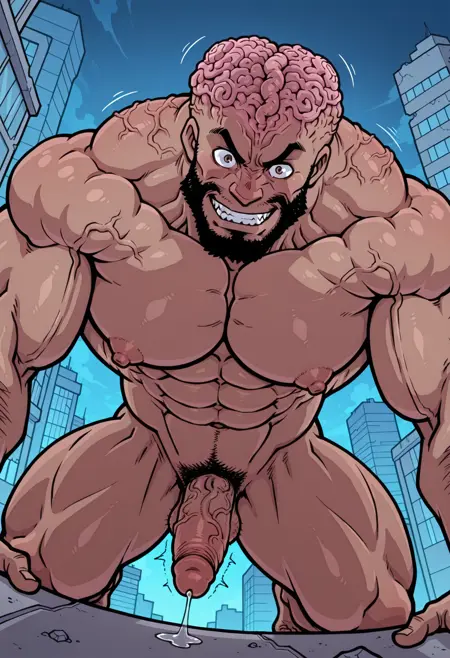 Angstrom Levy, Brown eyes, black beard, dark skin, bald head, external brain, full of veins, brain veins, mutant head, abnormal head,