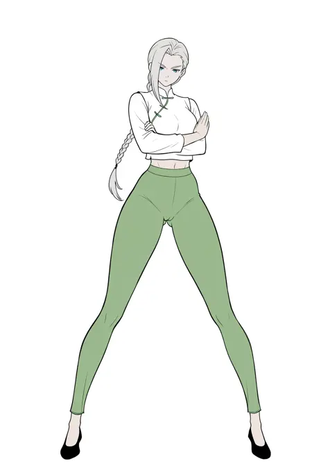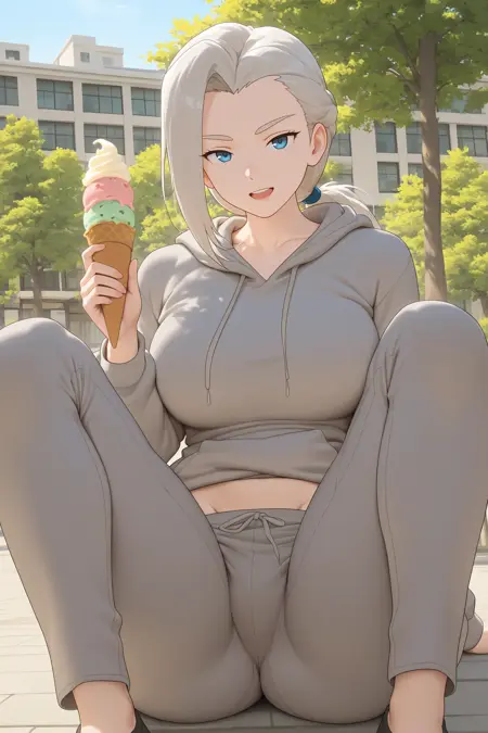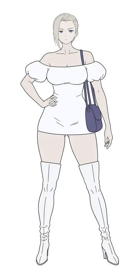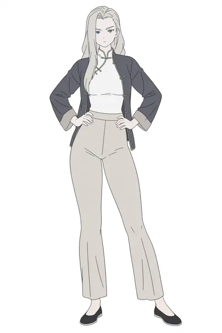 seniorluye, 성숙한 여성, 1소녀, 1소녀, 장갑, 혼자, 손가락 없는 장갑, 부츠, 바지, 검은 장갑, 파란 눈, 긴 머리, 언더머리, 흰 바지, 뒤를 돌아보며, 재킷, 후드, 전체 신체, 벨트, 케이블, 뒤에서, 파우치, 시청자 바라보기, 후드 내려짐, 검은 신발, 회색 머리, 파란 재킷, 주머니, 파란 재킷 흰 바지 파란 목걸이 흰 셔츠