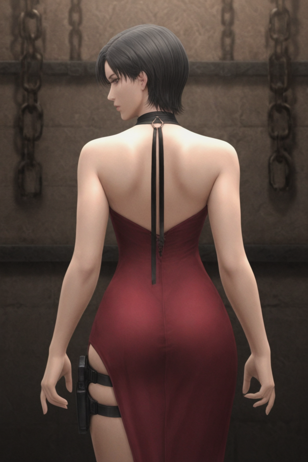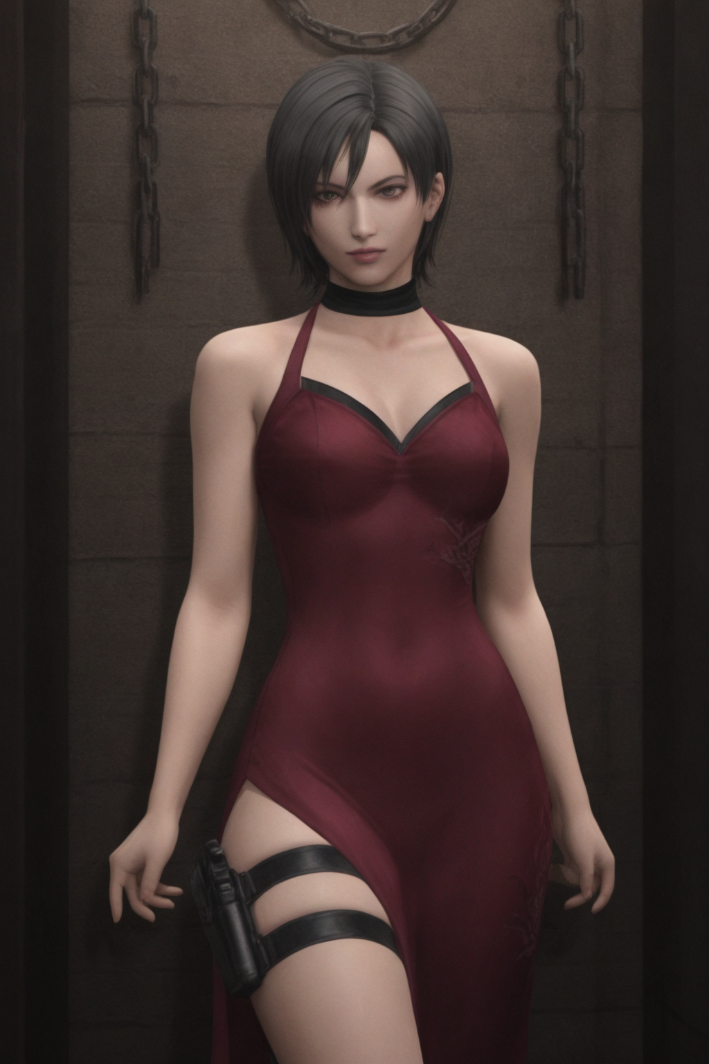 トリガーワード:adawongre4, 1girl, 茶色の目, 黒髪, 短髪, 前髪, ドレス, 赤いドレス, 袖なし, 袖なしのドレス, チョーカー, チェーン, 黒いチョーカー, ホルスター, 肩出し, ハイヒール,