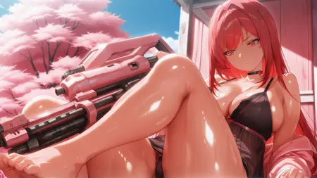 Example prompt : long hair, , bangs, large breasts, hair ornament, red eyes, , ribbon, navel, jewelry, hair ribbon, ponytail, sidelocks, red hair, , hairband, choker, bracelet, shirt, short sleeves, bikini, side-tie bikini bottom, highleg, shirt lift, lifted by self, highleg bikini, see-through,