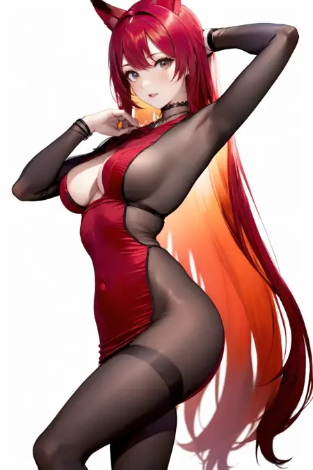 • 触发词(Trigger word):1girl,solo,jewelry,dress,necklace,red dress,breasts,high heels,pantyhose,see-through,