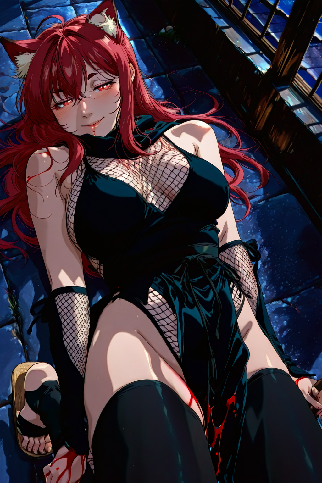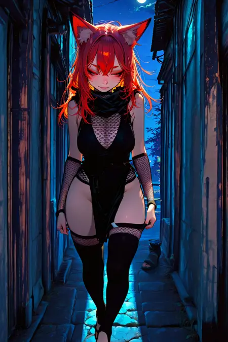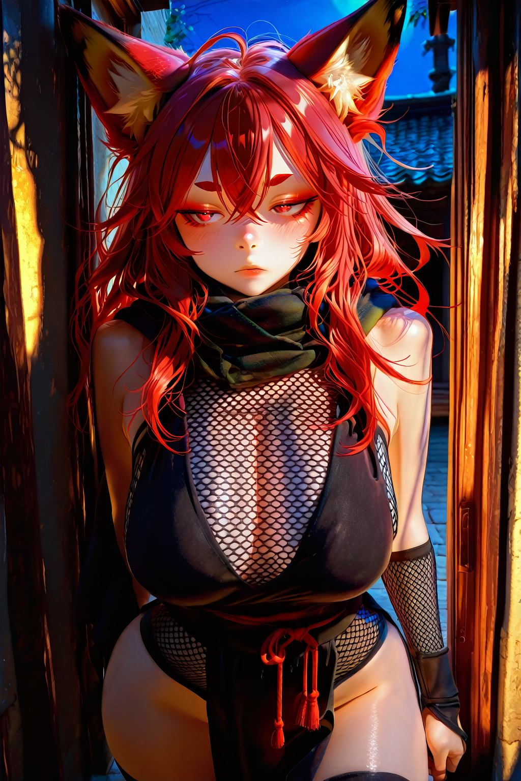 トリガーワード(Trigger word)****: fishnets,thighhighs,black top,black thighhighs,ninja,pelvic curtain,breasts,black scarf,leotard,toeless legwear,sandals,
