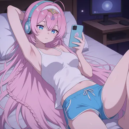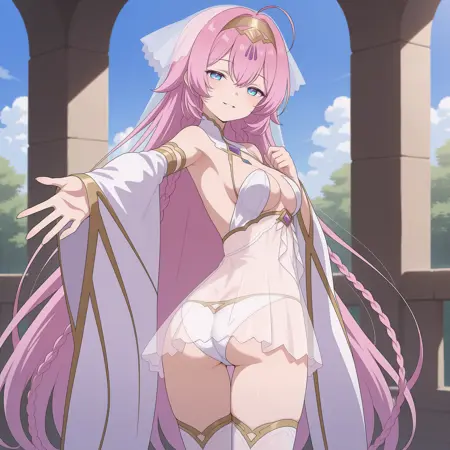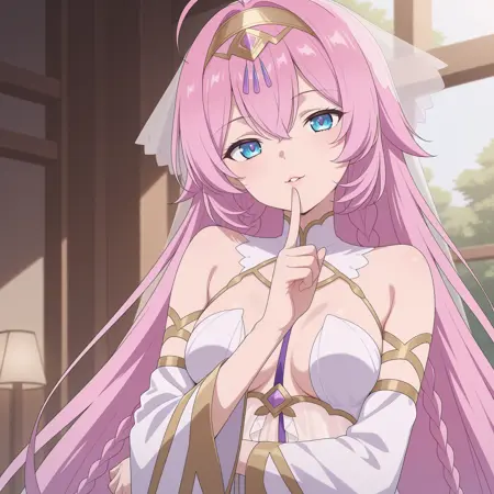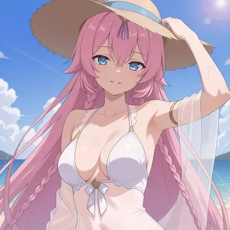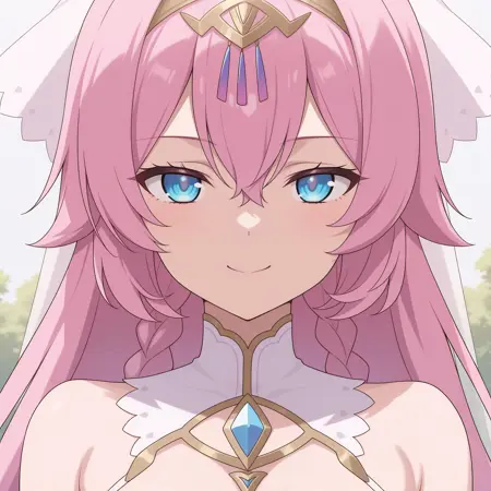 外見: 青い目、ピンクの髪、非常に長い髪、編み込み、中央で分けた前髪、あほ毛、中程度の胸
