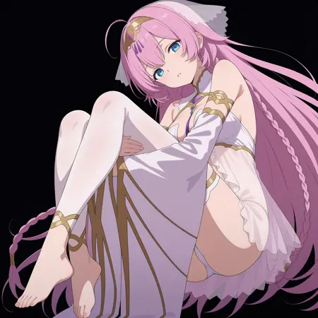 衣装とその他のアイテム: 金色のヘッドバンド、紫色の髪飾り、ヴェール、露出の多い服、外側の袖、広い袖、外側の高めの襟、透ける中裂きのシャツ、白い太ももハイソックス、素足
