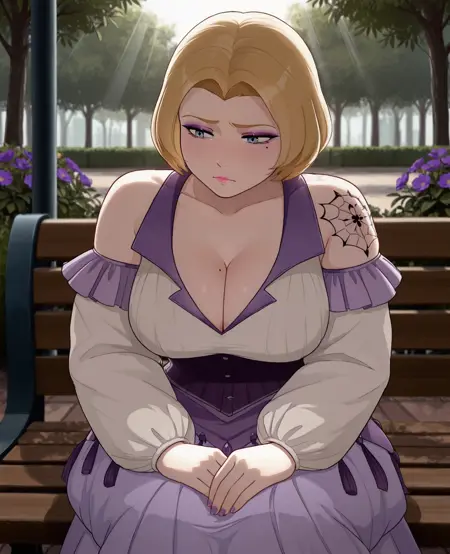 Outfit: purple dress, corset, cleavage, long sleeves, frills, bare shoulders, brown footwear, shoes