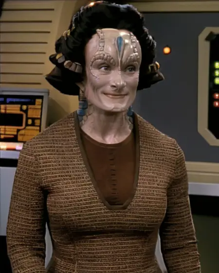 Tekeny 的服装:黑色与银色背梳发型,身穿卡达西总督制服,左胸佩戴金色总督徽章