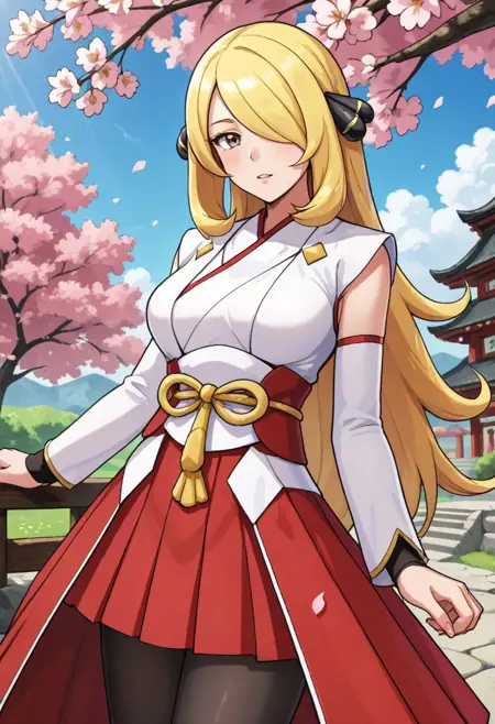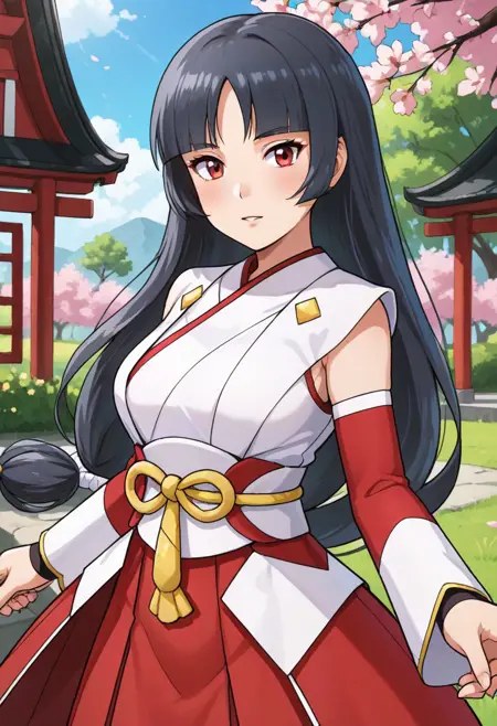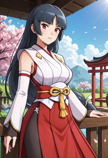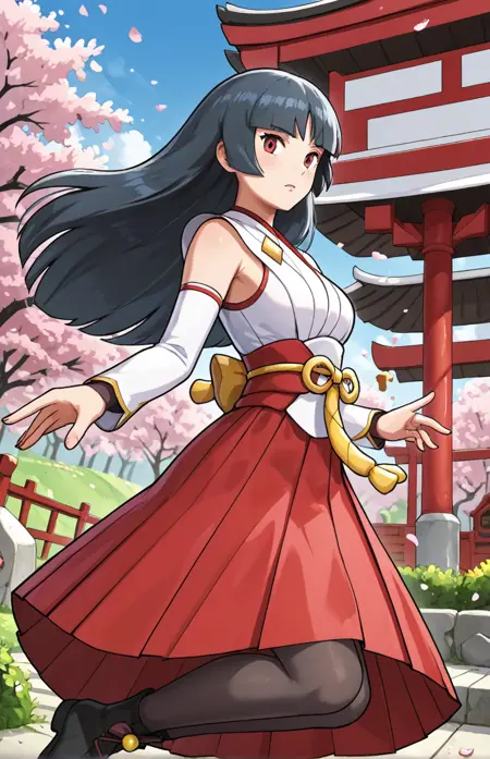 miko, 일본 복장, 톤 온 톤 드레스, 흰색 드레스, 빨간색 드레스, 쇼걸 스커트, 분리식 소매, 긴 소매, 하카마 짧은 스커트, 주름 스커트, 빨간 스커트, 검은 스타킹, 앵클 부츠, 검은 신발