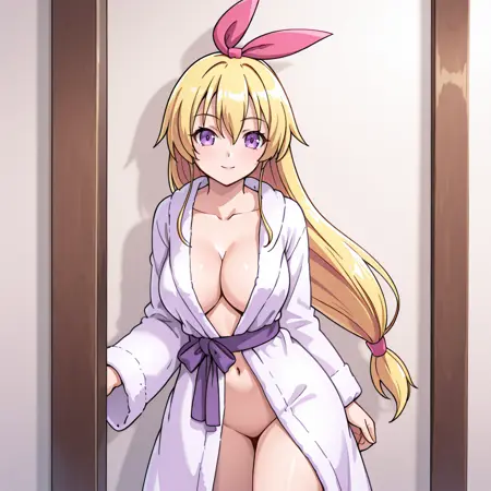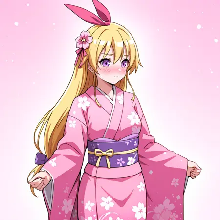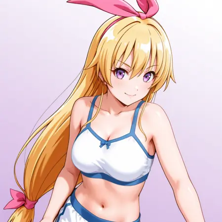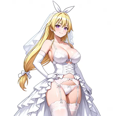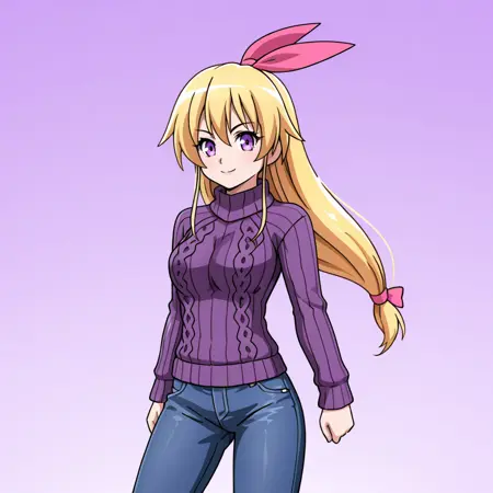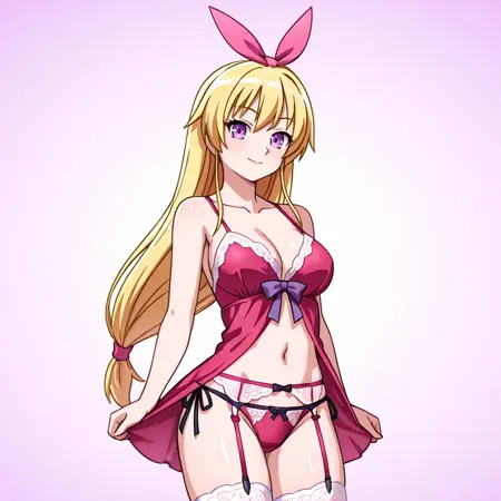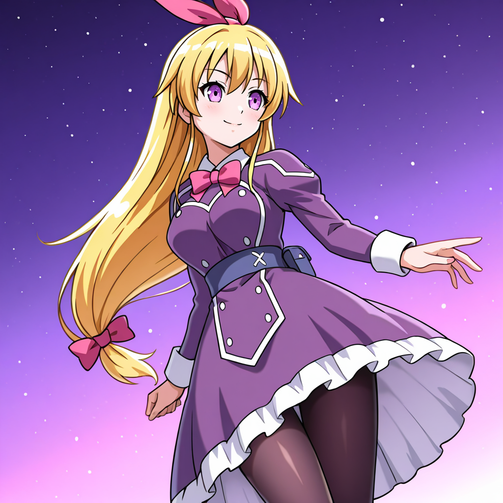 트리거: alicianrone, 1girl, 금발, 보라색 드레스, 보라색 눈, 팬티스타킹, 리본, 헤어리본, 바이트