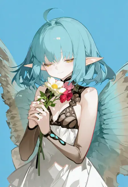 hope \(fate\), pointy ears, blue hair, bridal gauntlets, wings, dress, yellow eyes, ahoge,