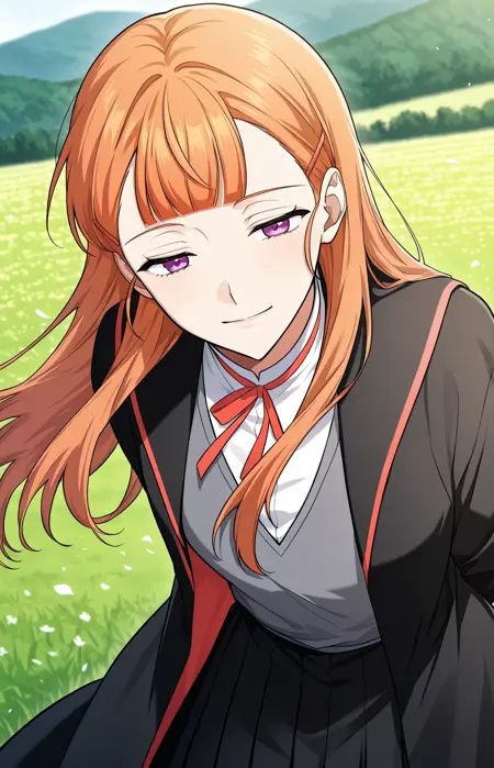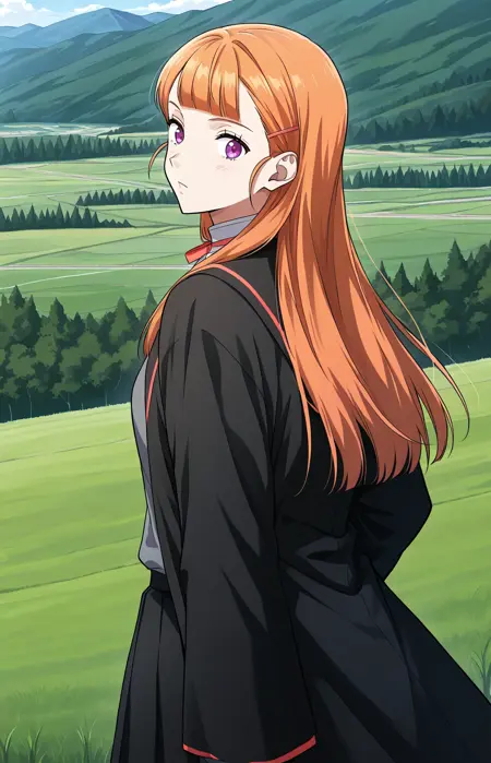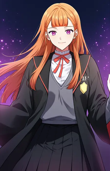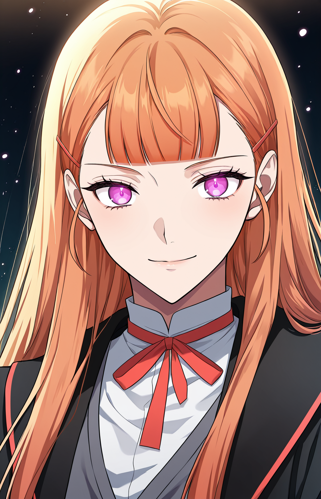 Sharelle, 1 girl, solo, orange hair, long hair, straight hair, blunt bangs, side hair strands, hairclip, purple eyes,