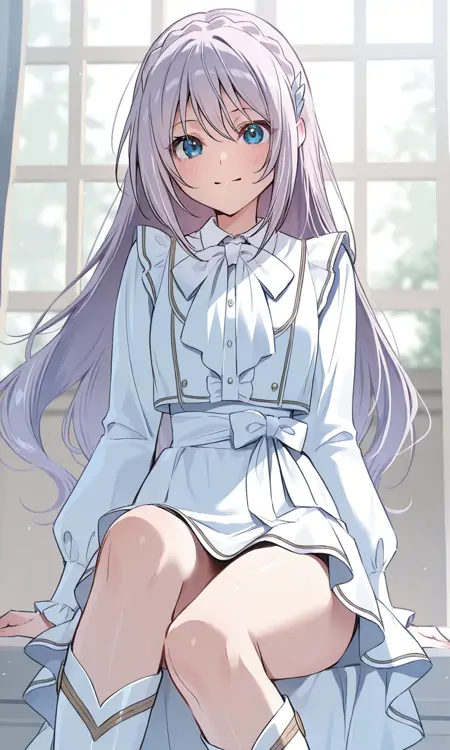 mokuromaku_lycia, white hair, blue eyes, sidelocks, crown braid, long hair, hair ornament, white dress, center frills, miniskirt, long sleeves, collared shirt, knee boots,