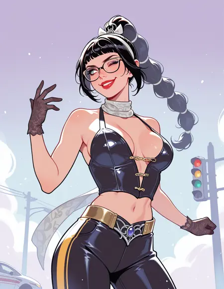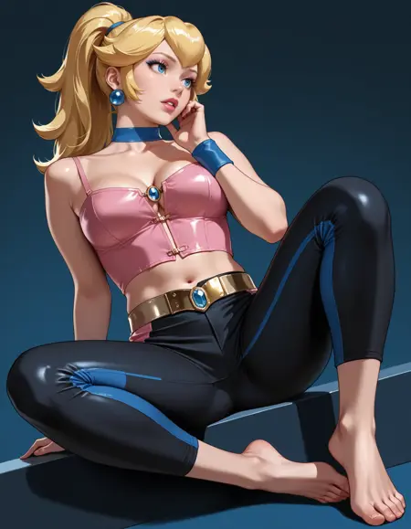 訓練済み: 青いバストイア、レザーバストイア、チョーカー、手首バンド、ゴールドベルト、宝石、レースストライプパンツ、カプリパンツ、ストラップヒール、ノーブラ