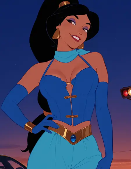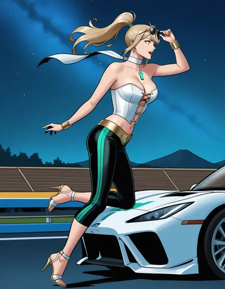 奇妙な魔術的な衣装を基に、縞模様のズボンと、レースクイーンの衣装にぴったりなファンタジーなベルト/バストイアが特徴。