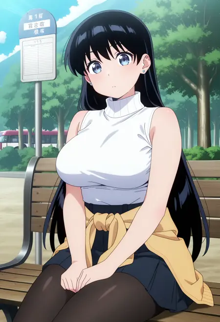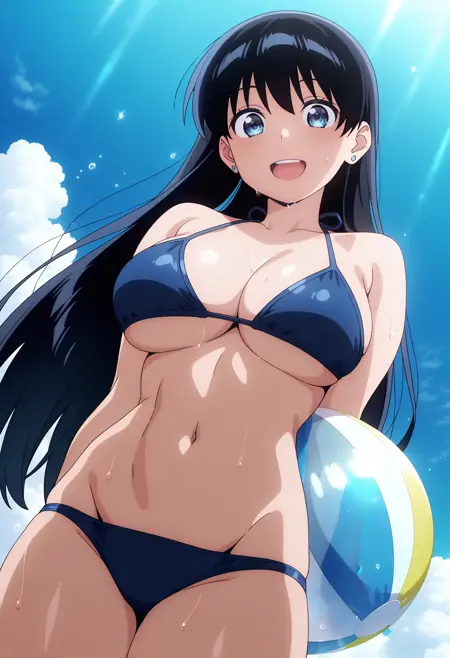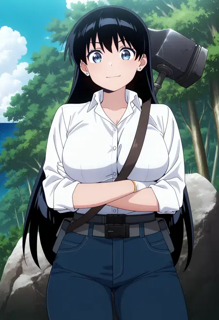 nagiwz, long hair, black hair, blue eyes, stud earrings, large breasts, collared shirt, white shirt, sleeves rolled up, white gloves, strap between breasts, weapon on back, hammer, belt, blue jeans