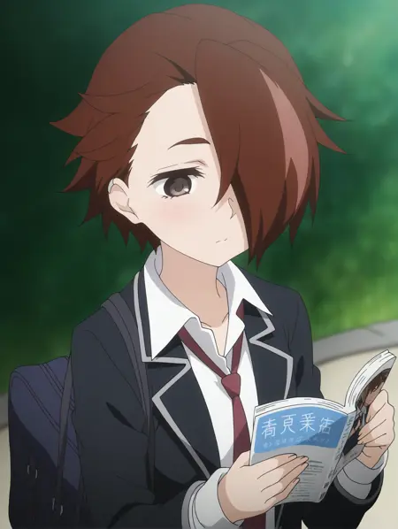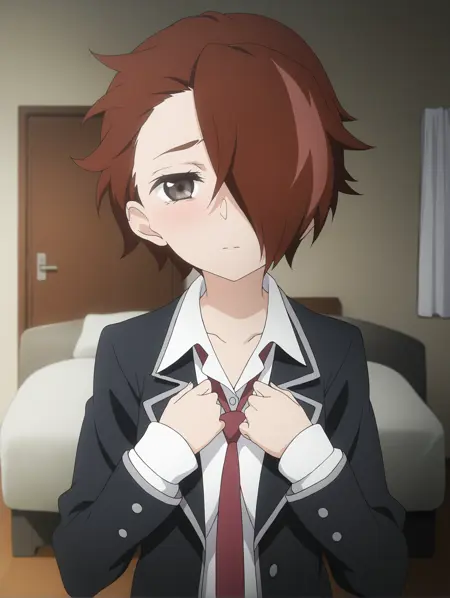 IL_Fumio, ソロ, 1girl, 茶色の髪, 短い髪, 片方の目に髪がかかる, 茶色の目