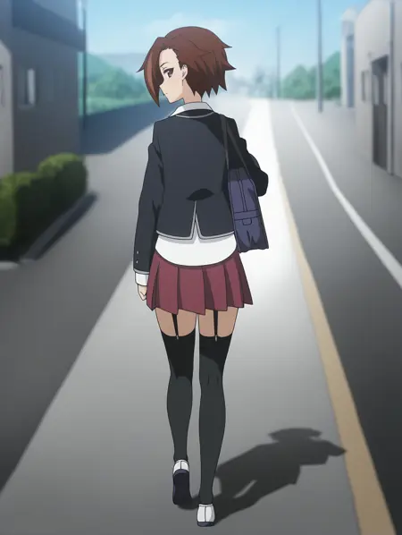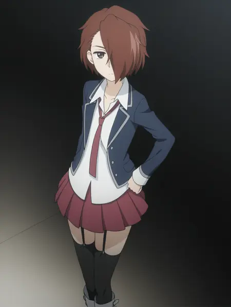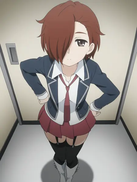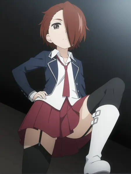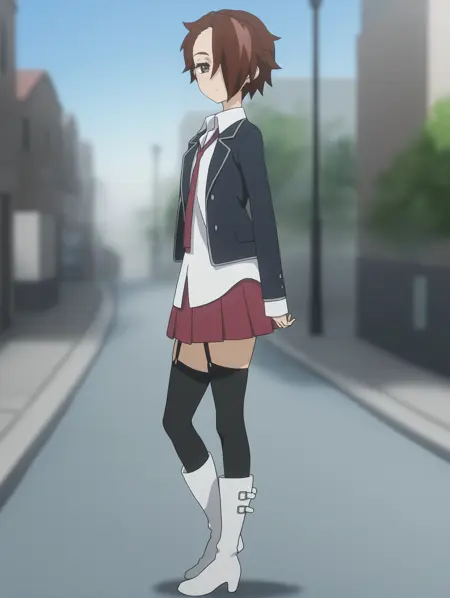 ももひき, 黒いももひき, スカート, 首ひも, ガーターストラップ, ジャケット, 白い靴, ブーツ, ブレザー, 赤いスカート, プリーツスカート, シャツ, 学校制服, 赤い首ひも, 白いシャツ, シャツ, リボン付きシャツ, 白いシャツ