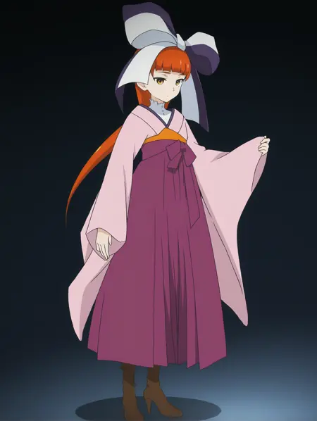 和服, ブーツ, 阪間, スカート, リボン, 阪間スカート, 着物, 髪のリボン, 茶色のブーツ, ハイヒール, ハイヒールブーツ, ピンクの着物, 赤い阪間, 赤い阪間スカート