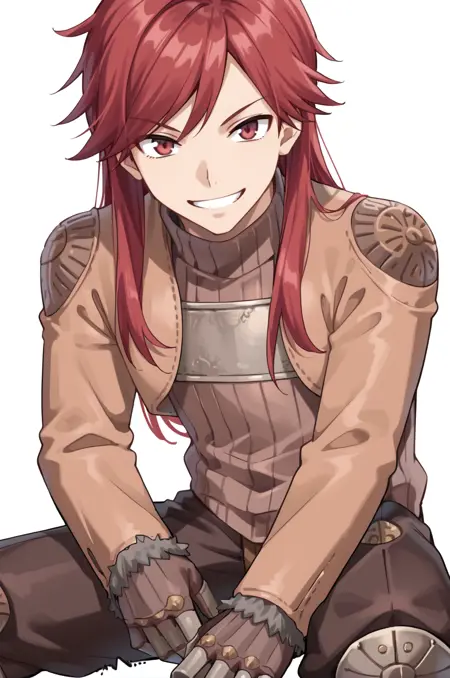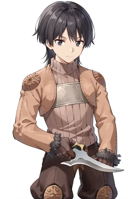 prompt: thiefROMale, brown jacket, brown pants, turtleneck, brown gloves, ribbed sweater, long sleeves, fur trim armored boots