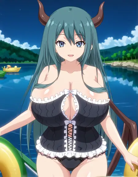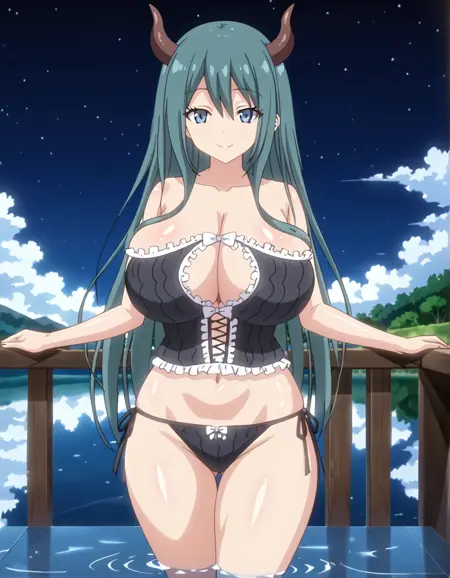 Rosary , Succubus, Green Hair, Long hair, Blue eyes, Brown horns, black corset, black dress, strapless, Gothic Dress, cleavage, frills