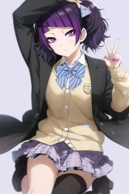 짧은 머리, 눈 아래 멜로, 멜로, 갈색 머리, 보라색 눈, 머리 장식, 머리핀, 1명의 소녀, 단독, 관람자 보기, 앞머리, 치마, 자켓, 긴 소매, 야외, 다수의 소녀, 검은 머리, 셔츠, 손톱 연마제, 네덜란드 각도