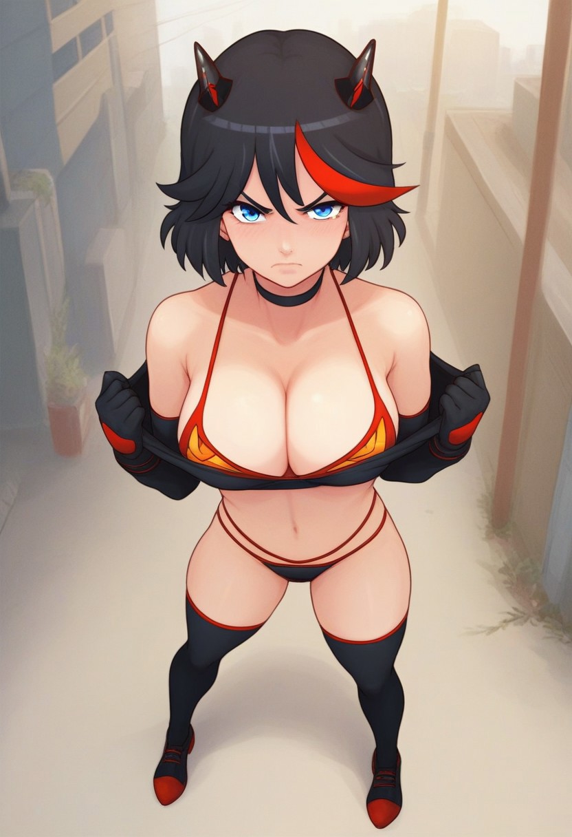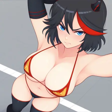 ryuko matoi,bikini, solo, black hair, short hair, underwear, multicolored hair, thighhighs, swimsuit, panties, armpits, gloves, blue eyes, breasts