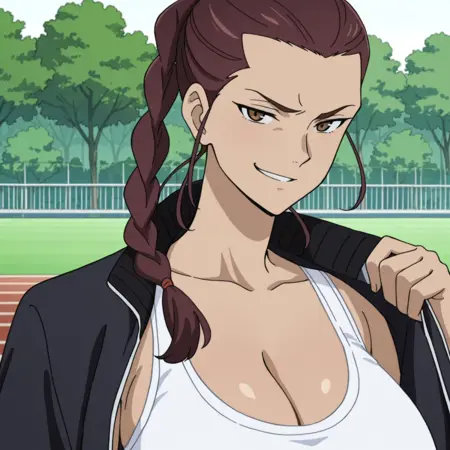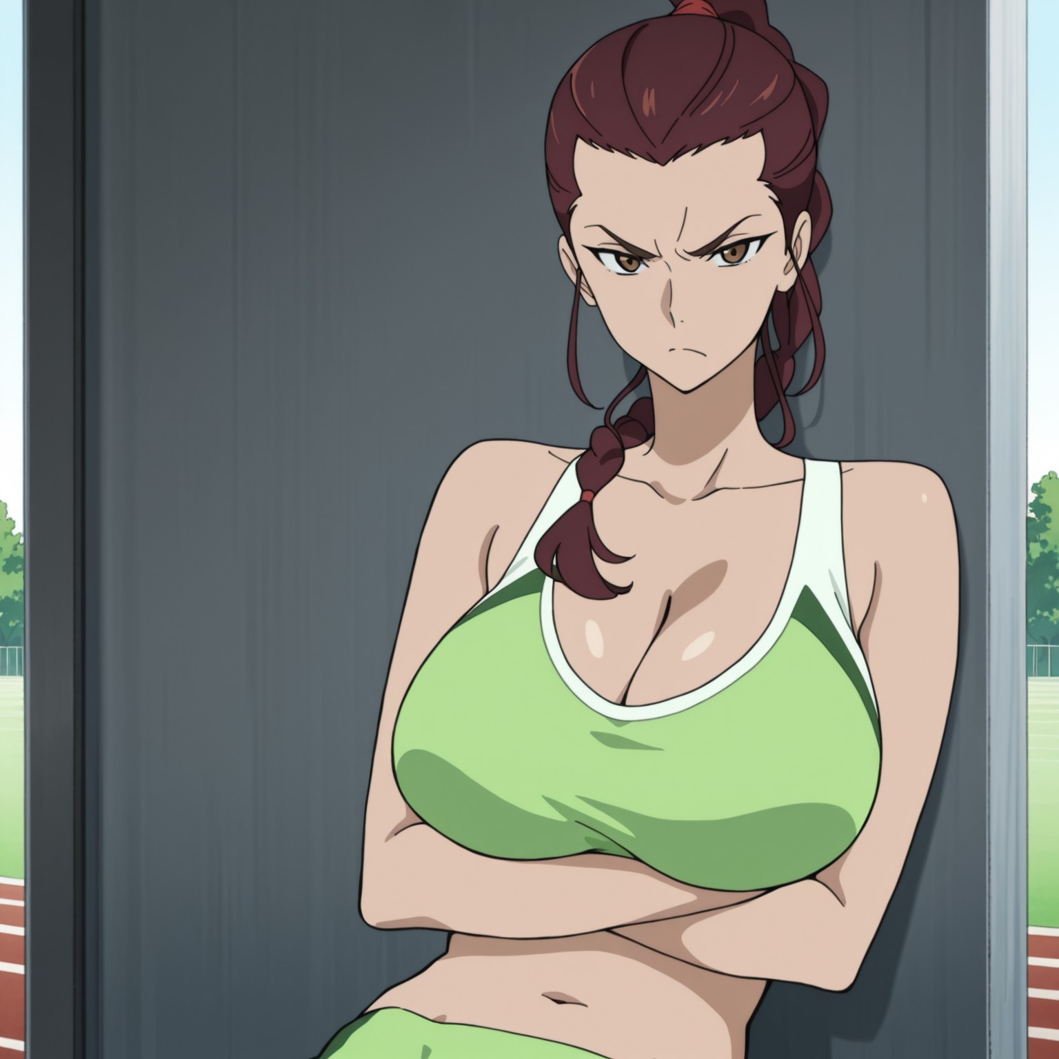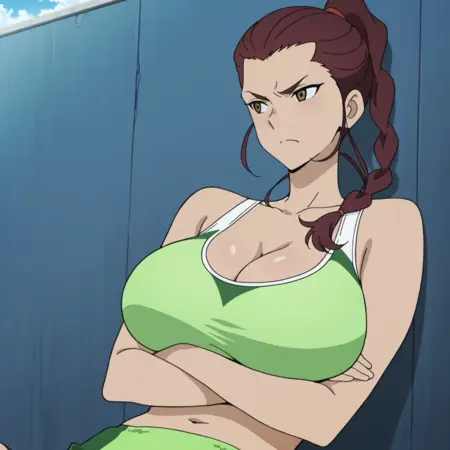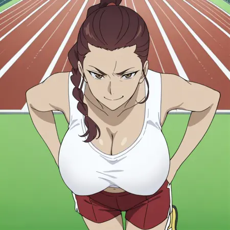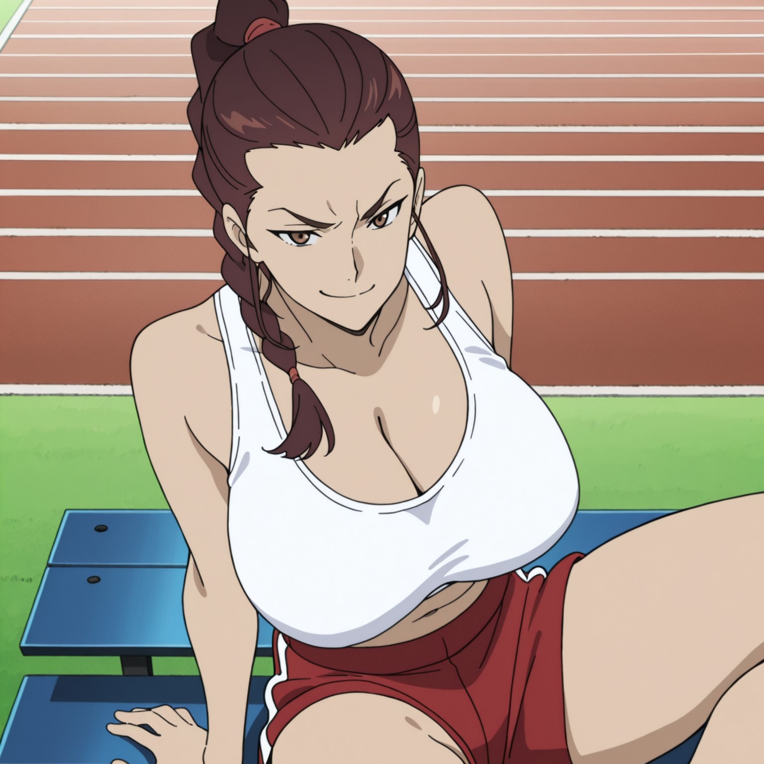训练装扮:mikokurodadmcbb,深红褐色头发,单条长辫马尾,棕色眼睛,纤细女性,大乳房,白色运动文胸,红白短裤,黄色鞋子