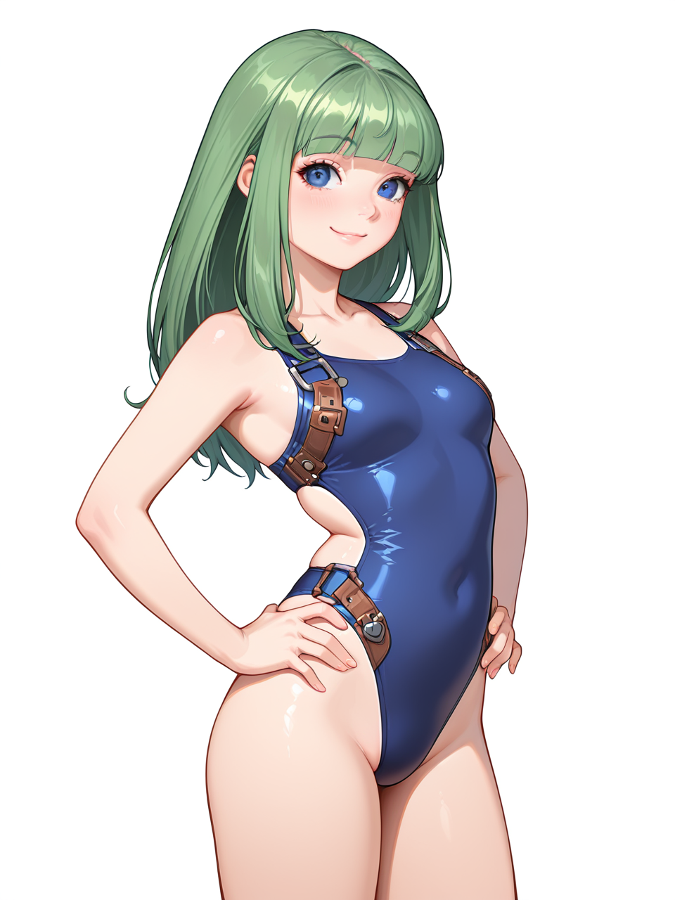 admias, blue eyes, swimsuit, one-piece swimsuit, blue one-piece swimsuit, buckles,
