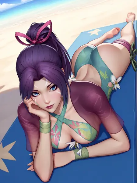 衣装キーワード: ワンピース水着、透け感のあるショール、サンダル、ガーターストラップ、リストバンド