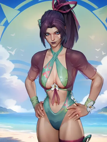 衣装キーワード: ワンピース水着、透け感のあるショール、サンダル、ガーターストラップ、リストバンド