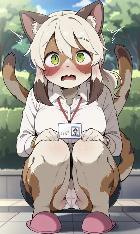 office lady, white shirt, id card, watch, collared shirt, long sleeves, black skirt, pencil skirt, pink slippers,