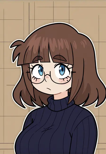 annacrayons、青い目、茶色の髪、ミディアムヘア、ストレートな前髪、濃い眉、半縁メガネ、ほくろ、目の下のほくろ