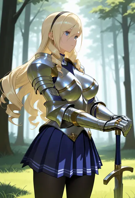 Trigger + Appearance: long hair, blonde hair, drill hair, black hairband, blue eyes, large breasts