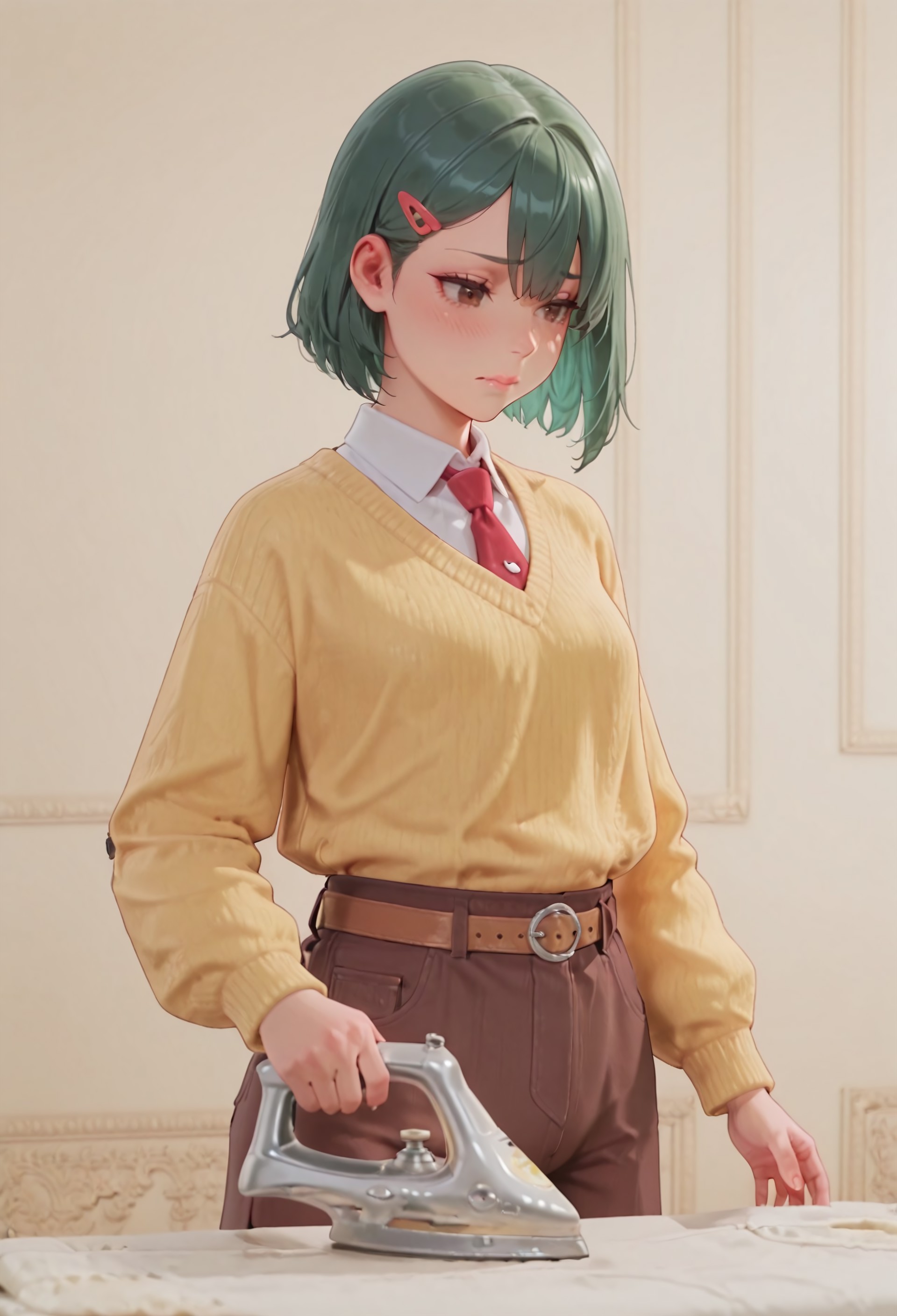 1girl, solo, 녹색 머리, 단발, 앞머리, 중간 갈라진 앞머리, 갈색 눈, 입, 작은 가슴