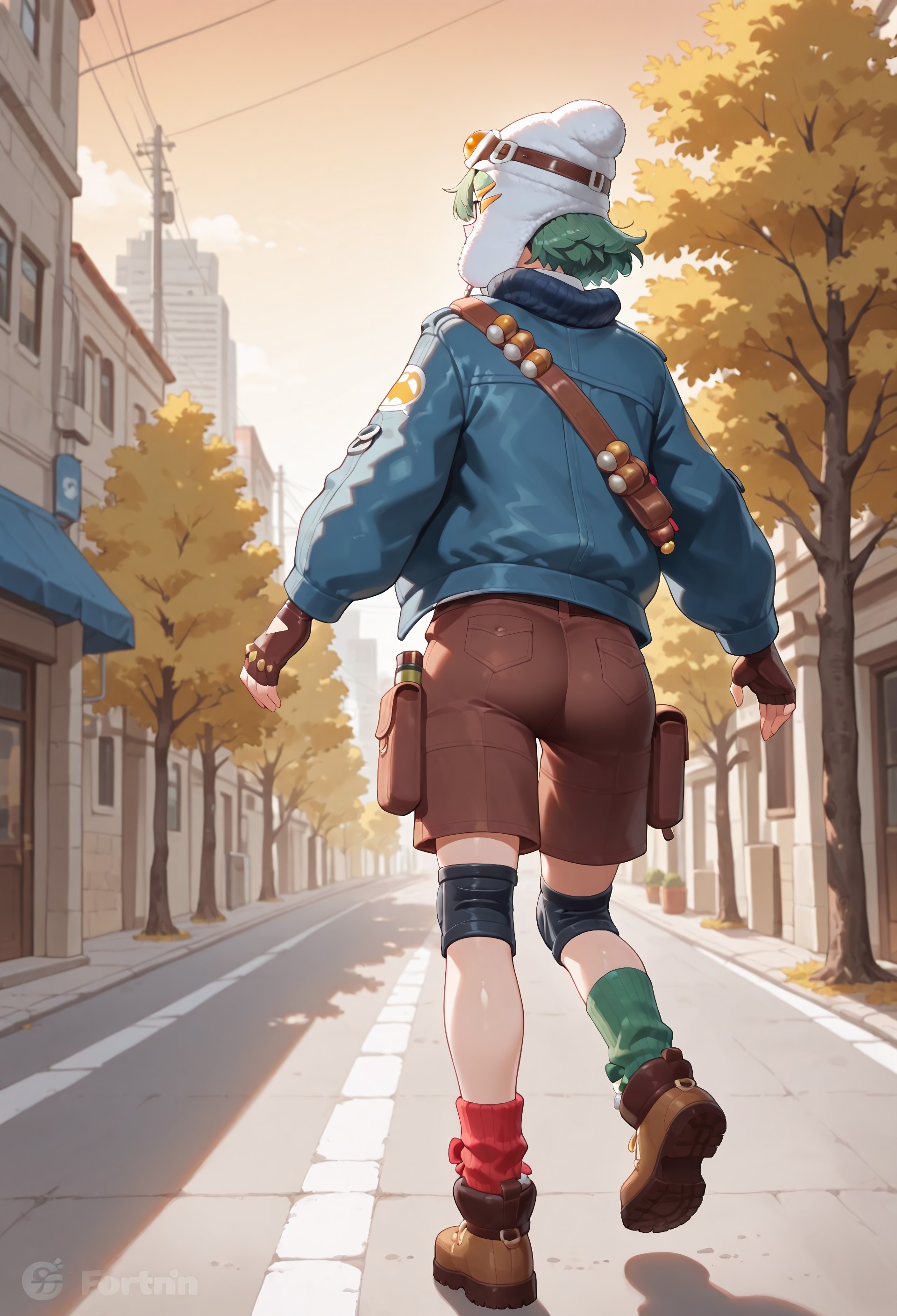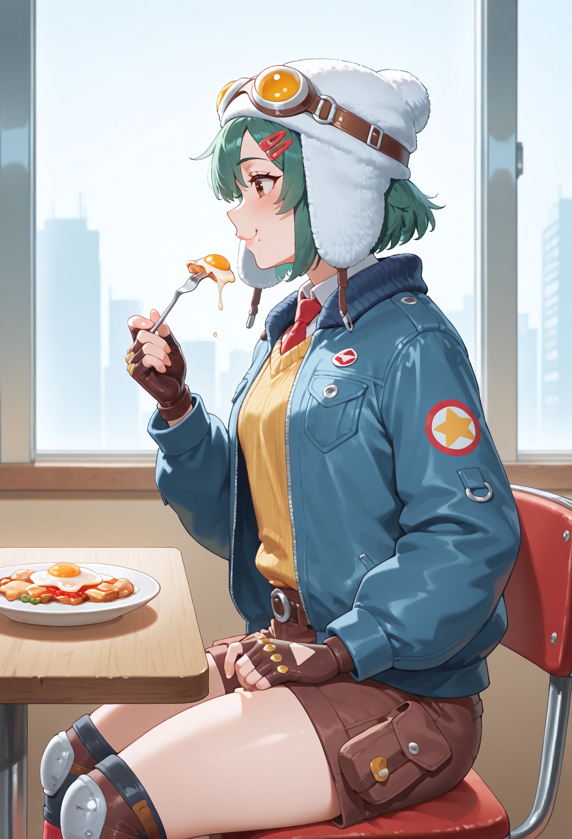 흰색 모자, 우샨카, 안경, 머리에 안경, 머리 장식, 머리핀, 파란색 재킷, 여는 재킷, 프린트 재킷, 긴 소매, 주머니, 가슴 주머니, 노란색 스웨터, 라운드 넥, 흰색 셔츠, 칼라 셔츠, 빨간 넥타이, 어깨 가방, 치킨 가방, 계란, 갈색 장갑, 손가락 없는 장갑, 벨트, 반바지, 갈색 반바지, 무릎 패드, 어긋난 하의, 불균형한 하의, 녹색 양말, 빨간 양말, 갈색 신발, UGG 부츠