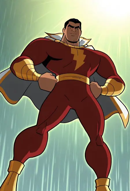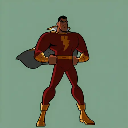 キャプテン・マーベル、1人、男性、筋肉質、黒髪、黒い眉、黒いドット模様の目、赤いボディスーツ、白いマント、金色のブレスレット、金色のベルト、金色のブーツ