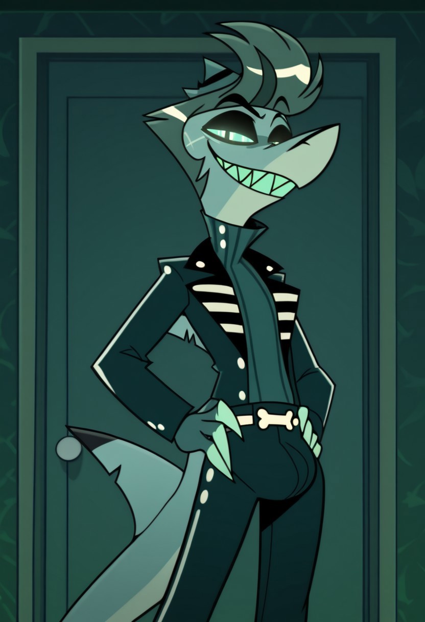 중요한 태그 - 측면 각도, 상어 코, 뼈 벨트 버클, 모자, 지느러미, 아가미 -