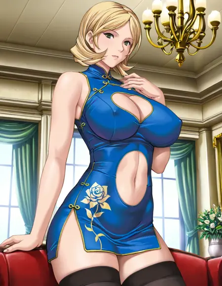 服装词: 蓝色连衣裙,露胸,乳房,乳头遮盖,服装镂空,中式服装,胸脯镂空,肚脐镂空,无袖连衣裙