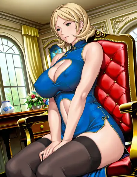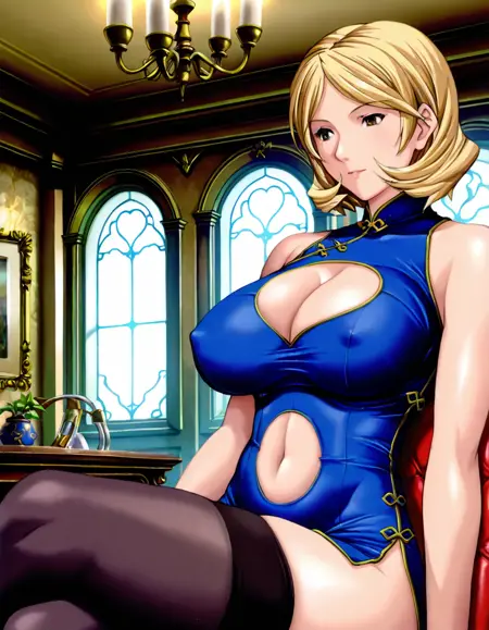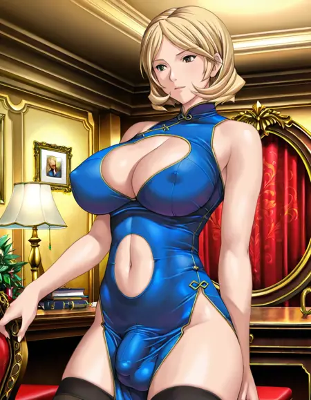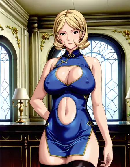 衣装単語: 青いドレス、胸元、胸、乳首が覆われている、服の切り抜き、中国風の衣装、胸元の切り抜き、へそ切り抜き、ノースリーブドレス