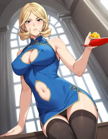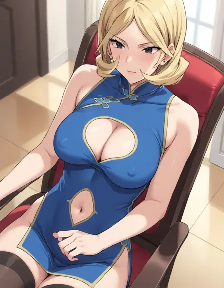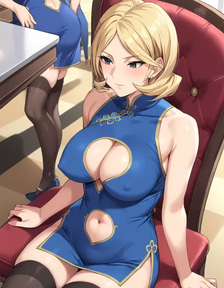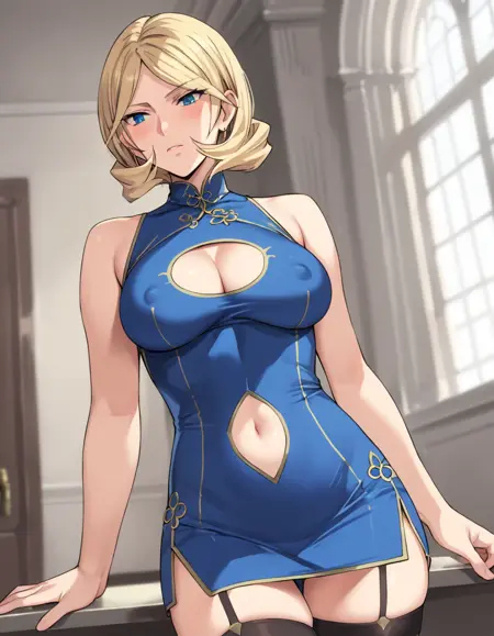 服装词: 蓝色连衣裙,露胸,乳房,乳头遮盖,服装镂空,中式服装,胸脯镂空,肚脐镂空,无袖连衣裙