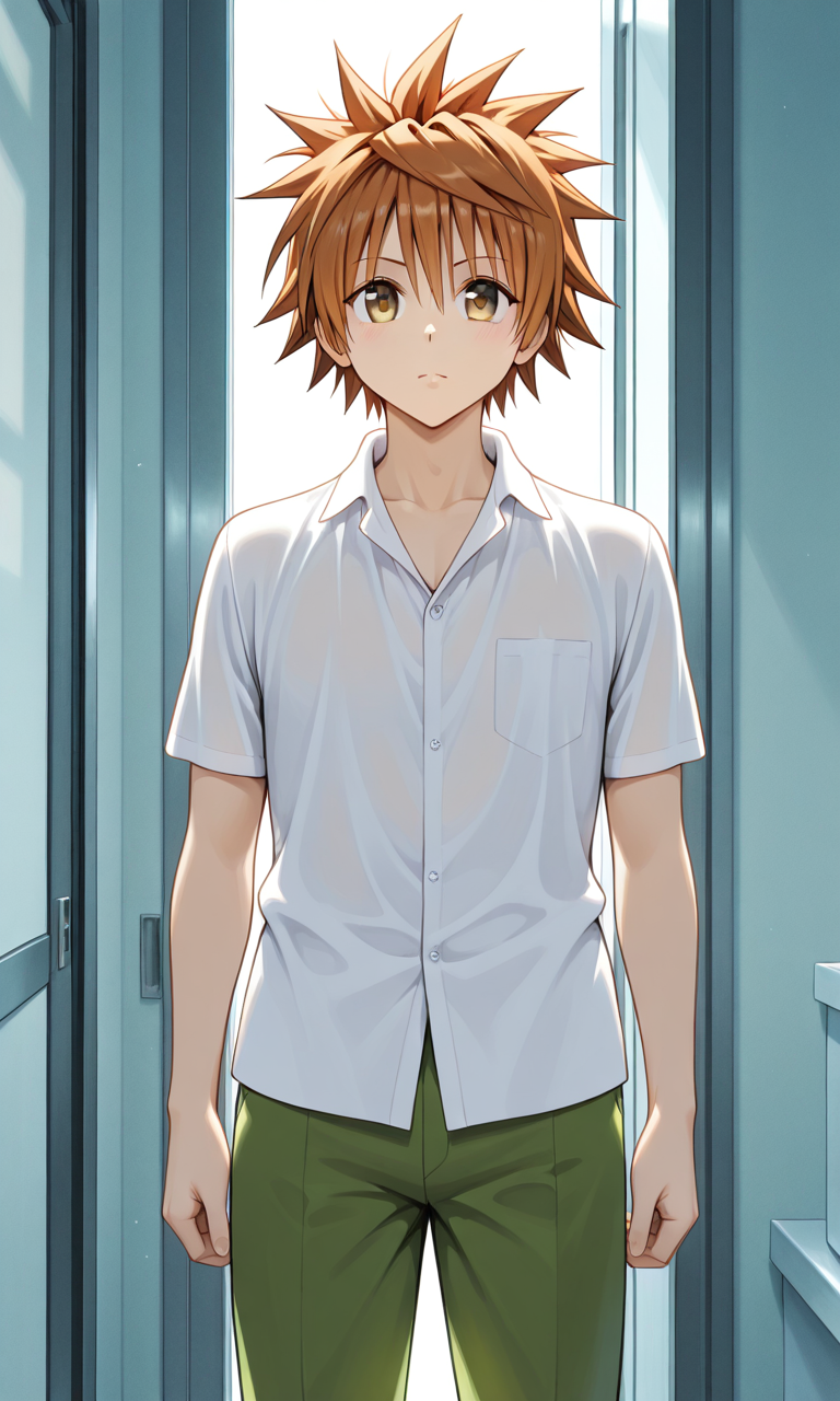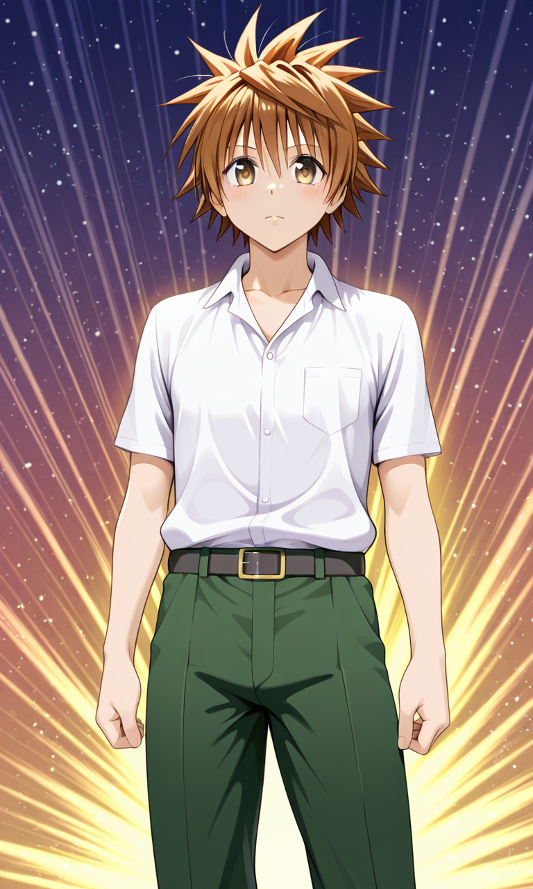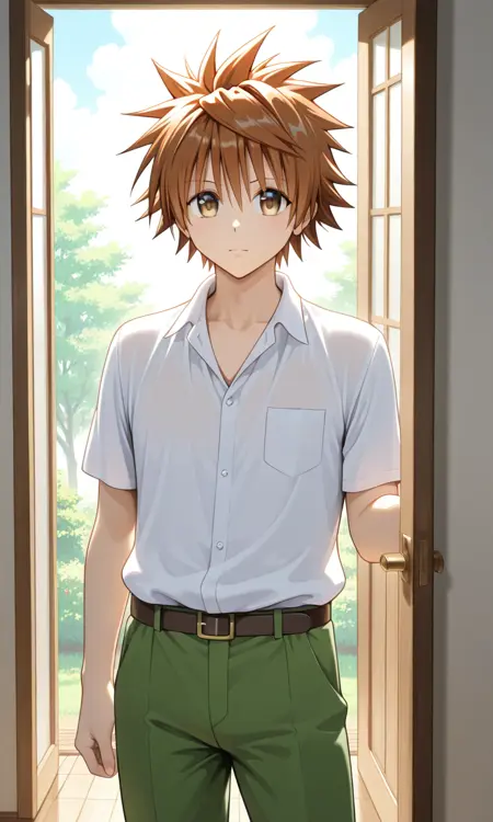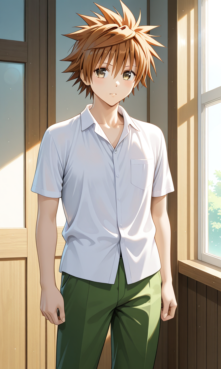 由崎琉斗,《To Love Ru》全系列,棕发,短发,Spike 发,金棕色眼睛,白色领衬衫,短袖,绿色裤子