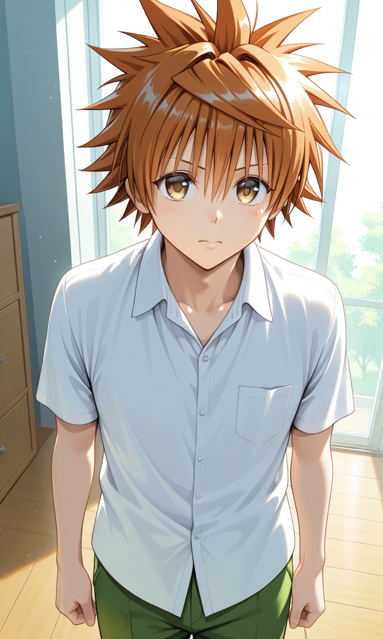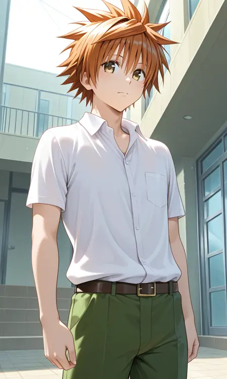由崎琉斗,《To Love Ru》全系列,橙发,短发,Spike 发,金棕色眼睛,白色领衬衫,短袖,绿色裤子