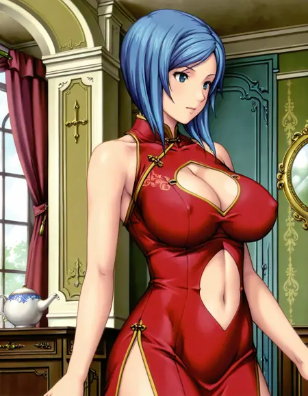 Costume words: red dress, cleavage, breasts, covered nipples, clothing cutout, chinese clothes, cleavage cutout, navel cutout, thighhighs, white thighhighs