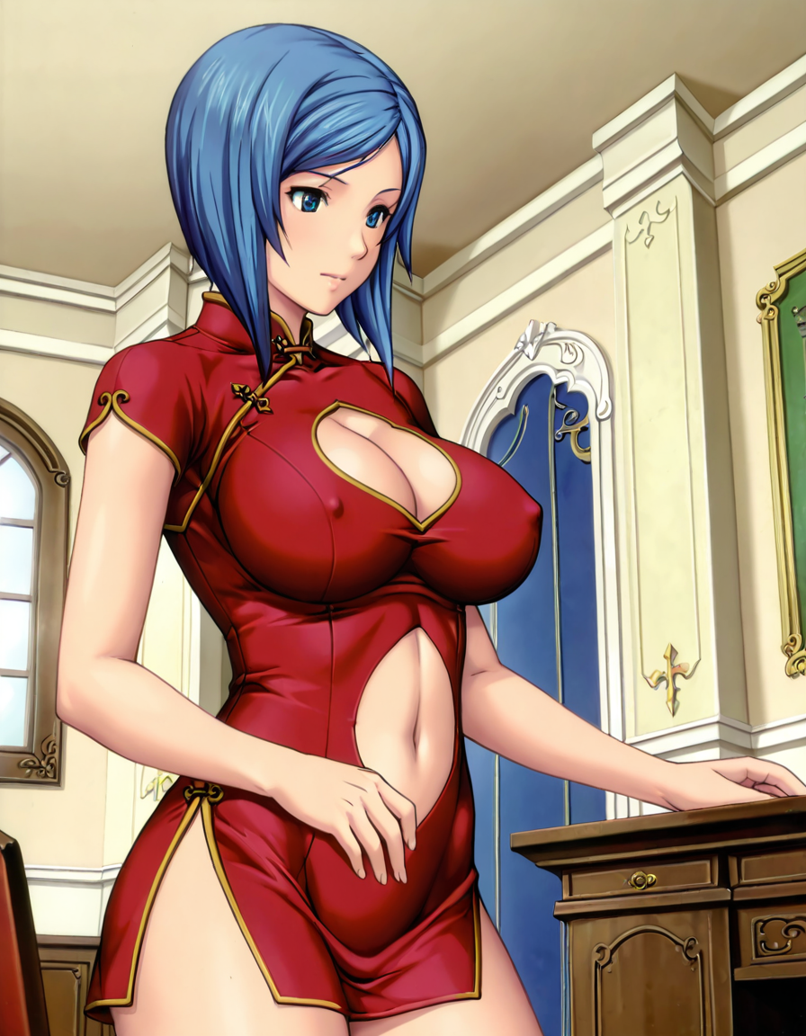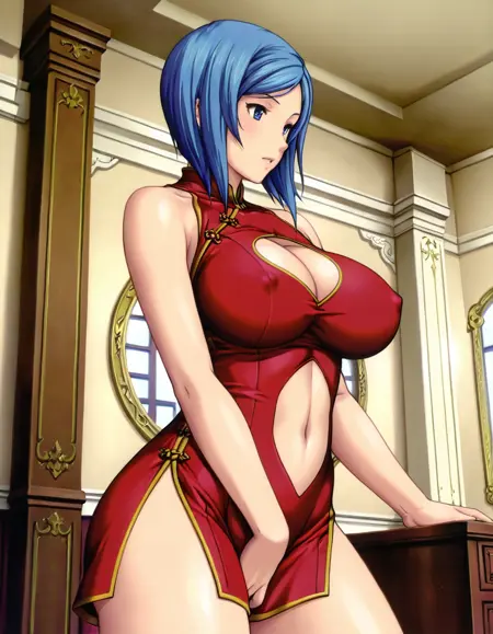 복장 단어: 빨간 드레스, 가슴 노출, 유방, 젖꼭지 가림, 옷 절개, 중국 옷, 가슴 절개, 배꼽 절개, 허벅지 양말, 흰 허벅지 양말