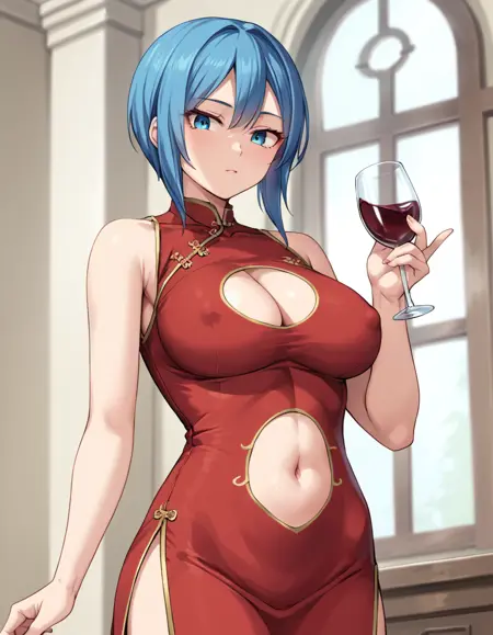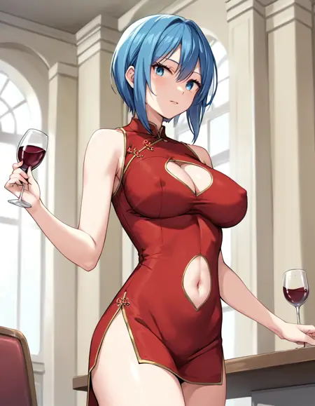 衣装単語: 赤いドレス、胸元、乳房、乳首カバー、服装の切り替え、中国風の服、胸元切り替え、おへそ切り替え、 thighhighs、白いthighhighs
