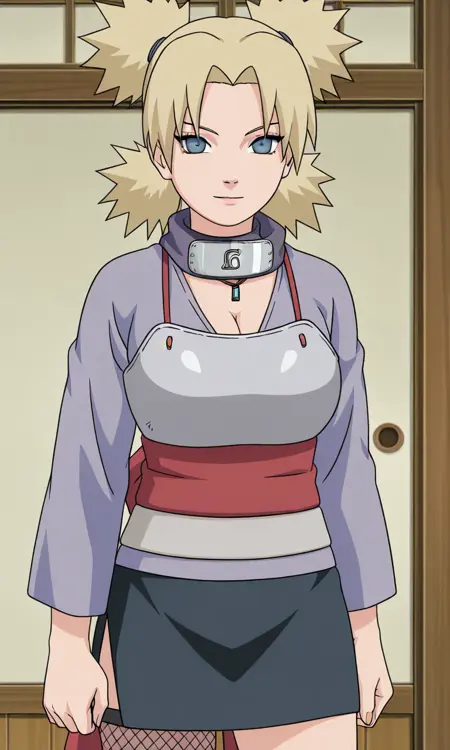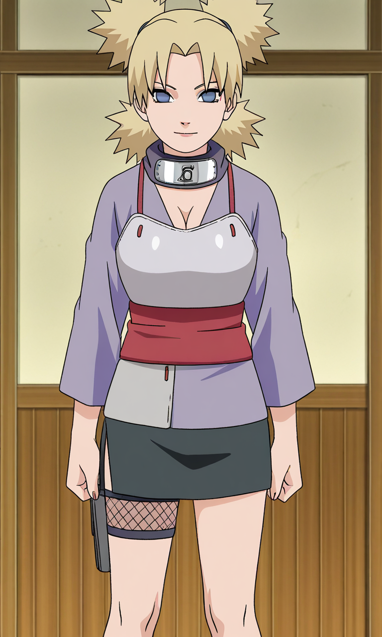 Temari,1girl,solo, blonde hair, short hair, blue eyes,quad tails, purple shirt, long sleeves, cleavage, breastplate, red sash, black skirt, necklace, black choker,large breasts