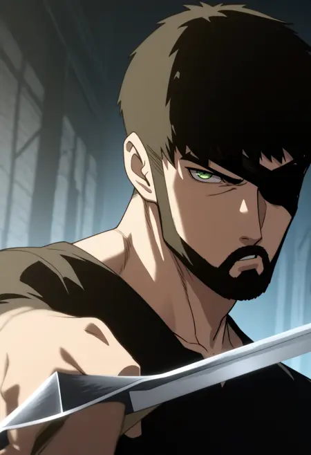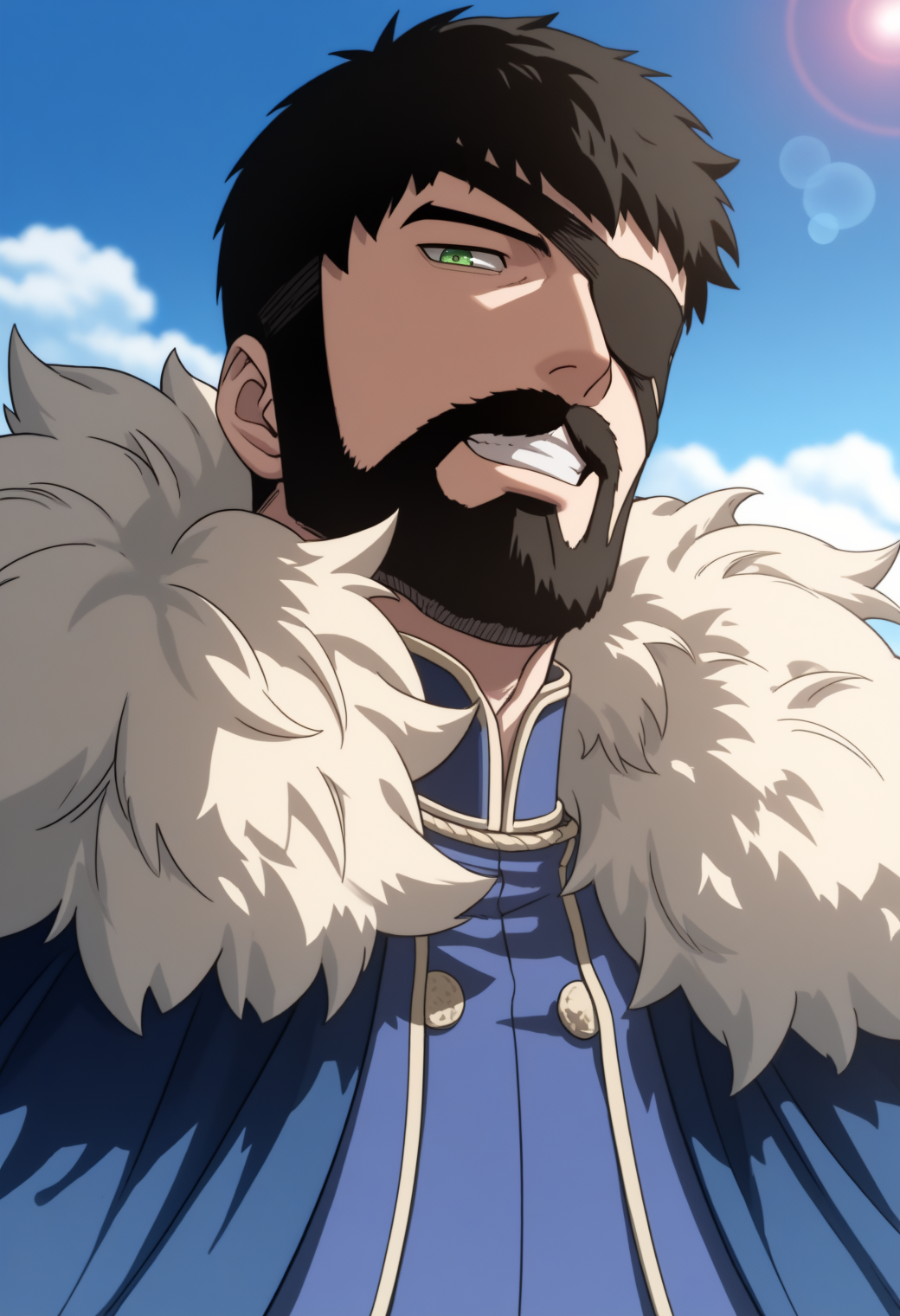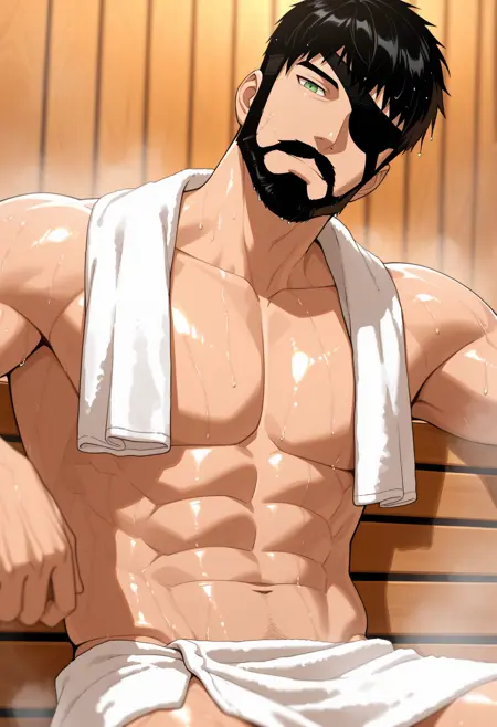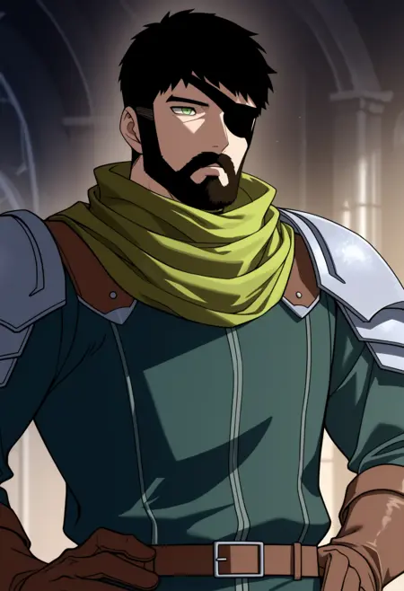 s1rj4g3r,black hair,green eyes,beard,mustache,sideburns,short hair,eyepatch