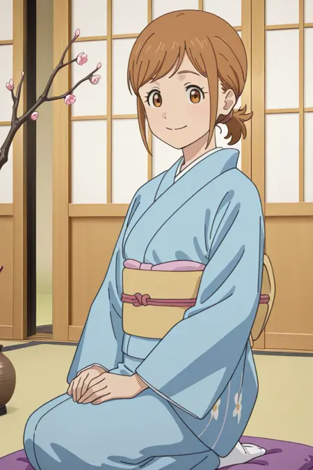 Sora: white shirt, light blue pants, blue belt, sandals / light blue kimono, sash, yellow obi, white socks
