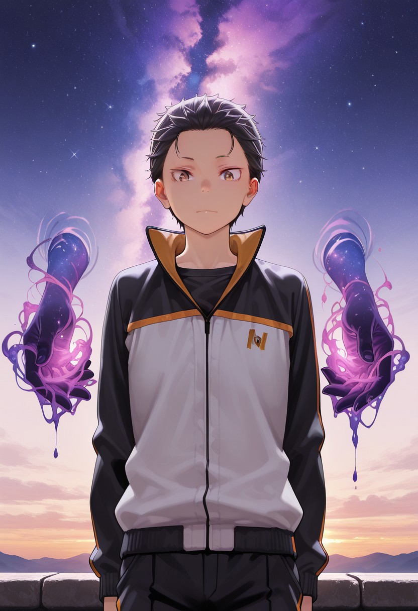 Subaru Natsuki, (Re:zero), black hair, brown eyes, short hair, Natsuki Subaru, hair slicked back, tracksuit. black white and orange tracksuit,