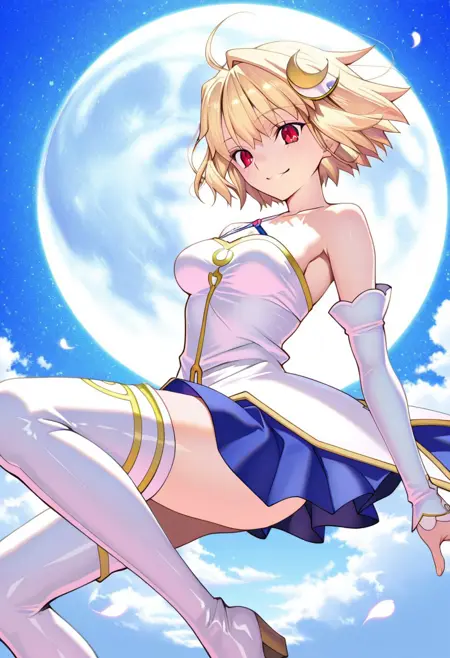 Phantasmoon:1girl,arcuied,blonde hair, red eyes, short hair,moon hair ornament, magical girl, very short dress, elbow gloves, bare shoulders, blue miniskirt, thigh boots, White gloves