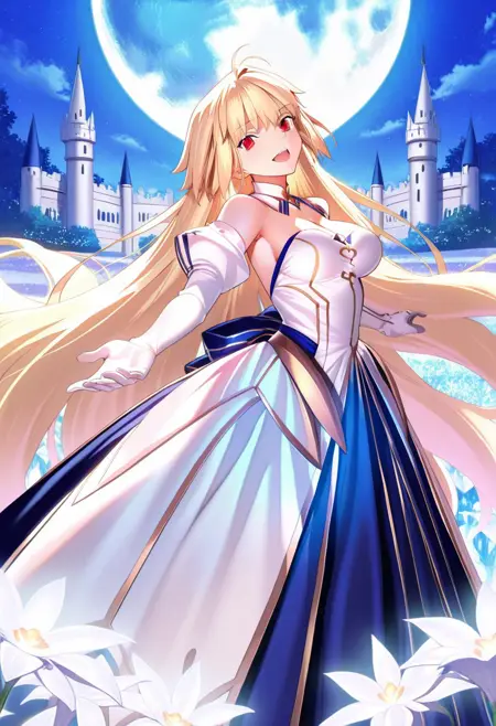 第1套:1girl,arcuied,blonde hair, red eyes,absurdly long Hair,long dress, blue skirt, elbow gloves, juliet sleeves, bare shoulders, detached collar, white gloves,